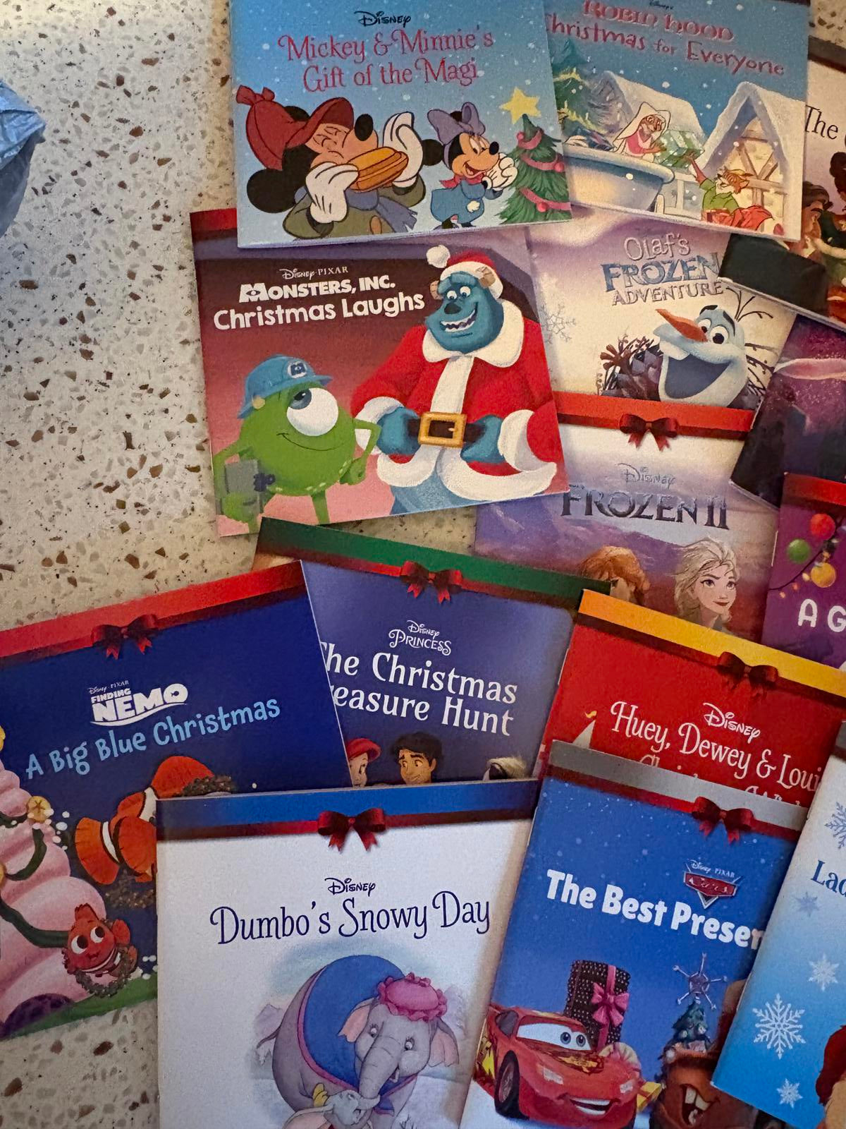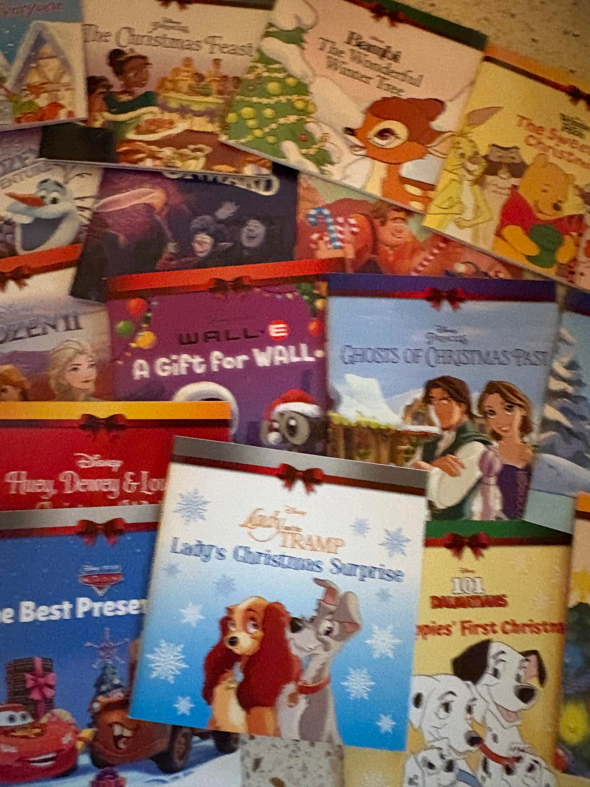 A collection of Disney Christmas-themed storybooks featuring beloved characters such as Lady and the Tramp, 101 Dalmatians, Frozen II, WALL-E, and more.